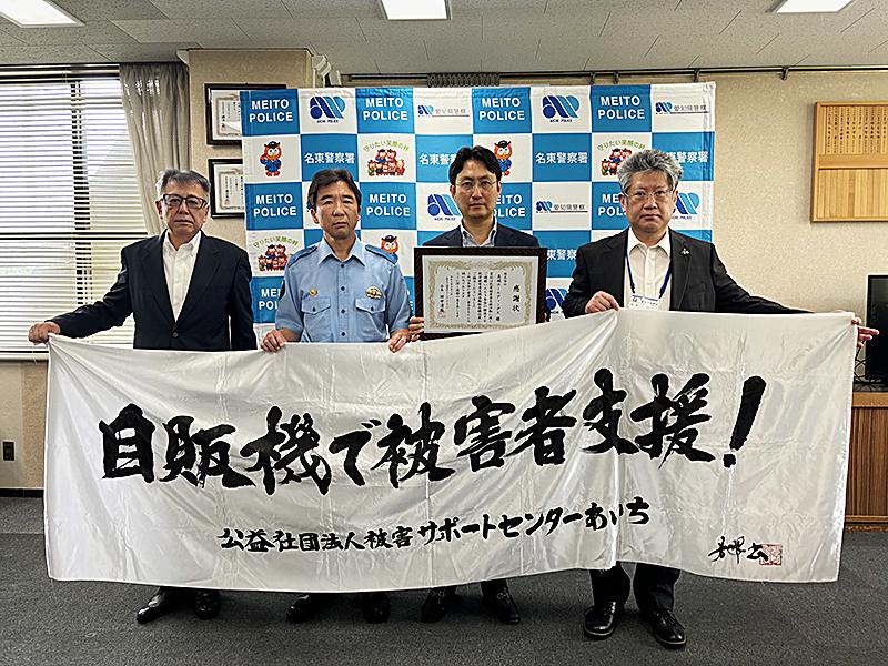 「プレイランドキャッスル」の屋号で愛知県を中心にパチンコホール14店舗を運営する真城ホールディングス(名古屋市)は7月2日、『プレイランドキャッスル上社店』に寄付型自動販売機を設置したことに対して名東警察署から感謝状が贈られた。