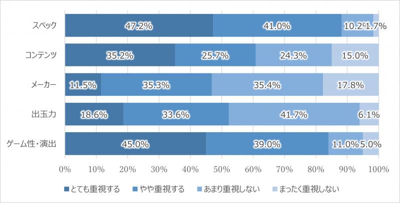 この結果をみると、「最も重視する」の回答割合が高かったのが「スペック」だった。どんなスペックを望むのかは、細分化して設問は設けなかったが、「出玉力」を重視するプレイヤーがそこまで多くなかったことを考えると、一概に射幸性だけを求めているわけではないことが分かる。