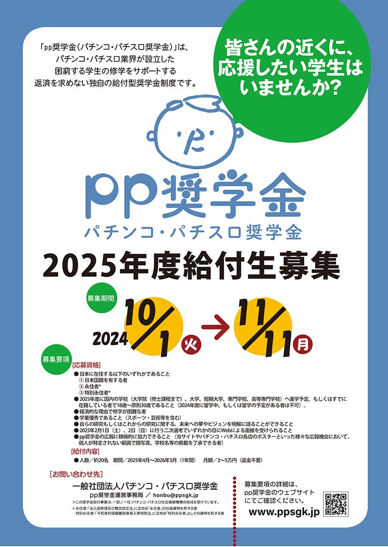 パチンコ・パチスロ奨学金(pp奨学金)は10月1日、2025年度給付生の募集を開始した。受付期間は11月11日まで。給付生には25年4月から26年3月までの1年間、月額3万円から5万円が給付される。