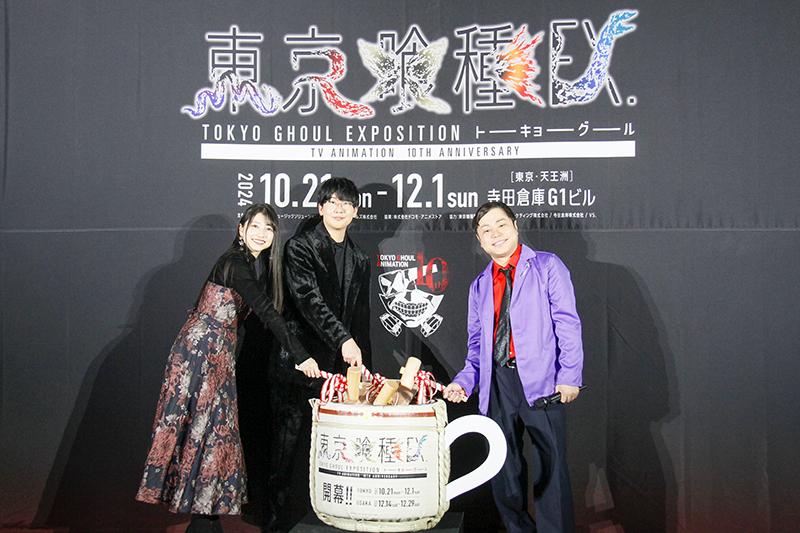オープン前日となる20日にはオープニングセレモニーを開催し、主人公・金木研役の花江夏樹さん、ヒロイン・霧嶋董香役の雨宮天さん、作品の熱烈なファンとしてNON STYLEの井上裕介さんが登壇。展示会の感想やアフレコ時の秘話などを語った。最後に作品をイメージした珈琲マグカップを模した鏡開きを実施し、展示会の開催を華やかに祝った。