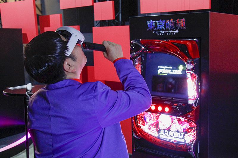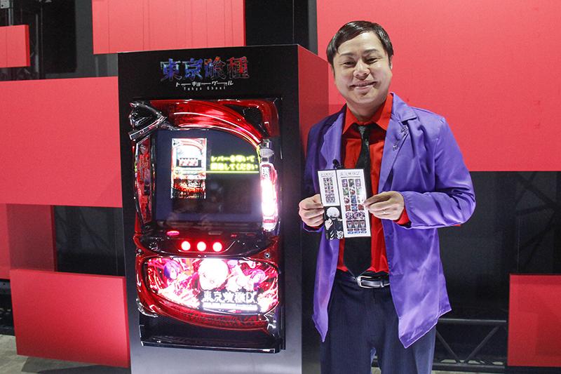このブースでは井上さんが映像を体験。井上さんは「360度見る場所によって映像が違ってくるし、何度も楽しみたくなりますね。素晴らしかったです」と感想を述べた。その後、ブースで来年2月導入予定の『L東京喰種』のCMが流されると「東京喰種は熱いバトルが多いから、スロットファンとしても楽しみですね。絶対打ちたい!」と導入を心待ちにしている様子だった。