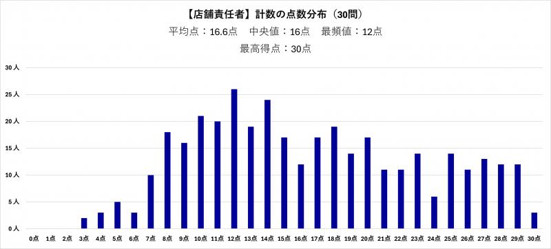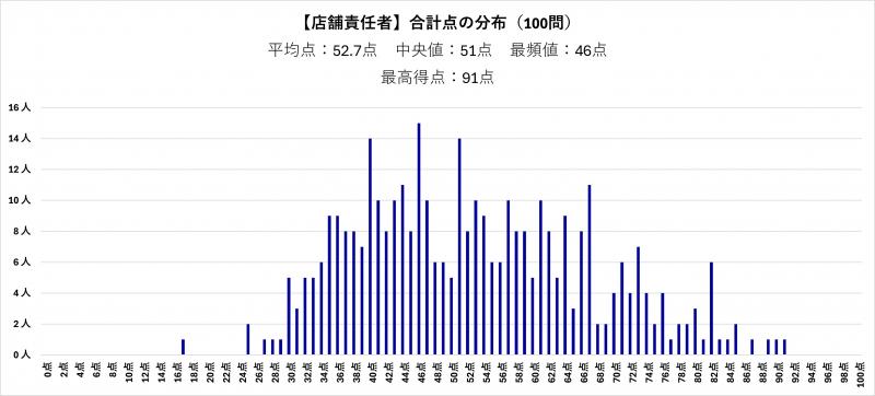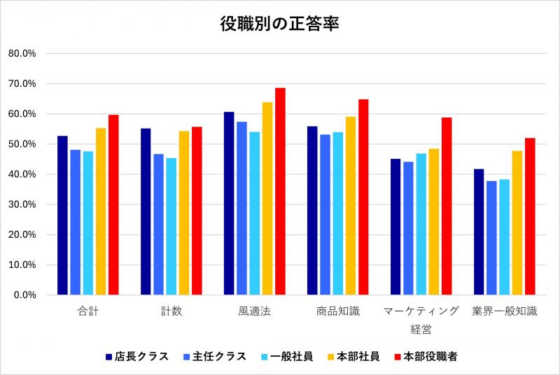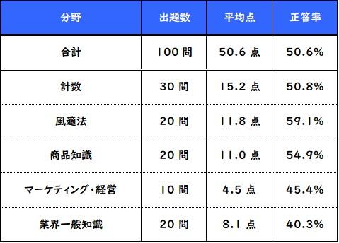 今回の受検者数は、店長クラス370人、主任クラス355人、一般社員71人、本部社員・役職者52人の計848人で、受検企業数は69社。平均得点は50.6点だった。各分野の平均得点や正答率などは以下の図の通り。