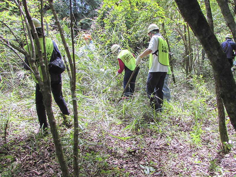 当日は家族を連れた組合員ら計61人が、3班に分かれて行動。植樹したヤマザクラなどの成長を促すために、周囲の雑草を除去してまわった。あいさつに立った家永浩明支部長は、熱中症への注意を呼び掛けた。
