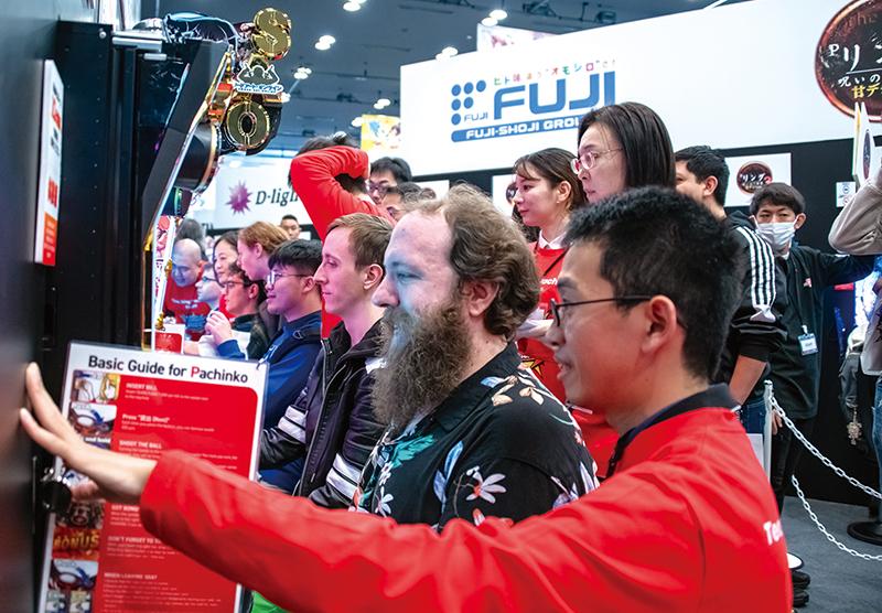 試打コーナーでは日遊協加盟ホールの中から英語、韓国語、中国語などに対応できるスタッフを配置。外国人に遊技方法を説明し、大当たりすると一緒に盛り上がるなどしてサポートした。会場の外ではちんどん屋やスタッフが積極的に外国人に声をかけ、インバウンドコーナーは終日列ができる盛況ぶりだった。