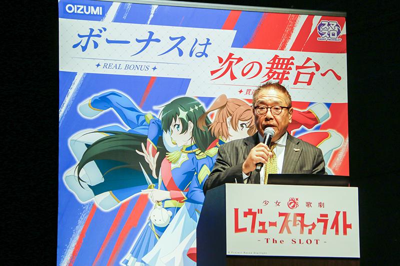 「素晴らしい作品とオーイズミ独自のゲーム性は、皆さまから必ずご支持いただけると確信している。設備事業を手掛けてきた当社は今後、遊技機事業にも本格的に参戦する。今作の A+AT スペックで市場に挑戦したい」