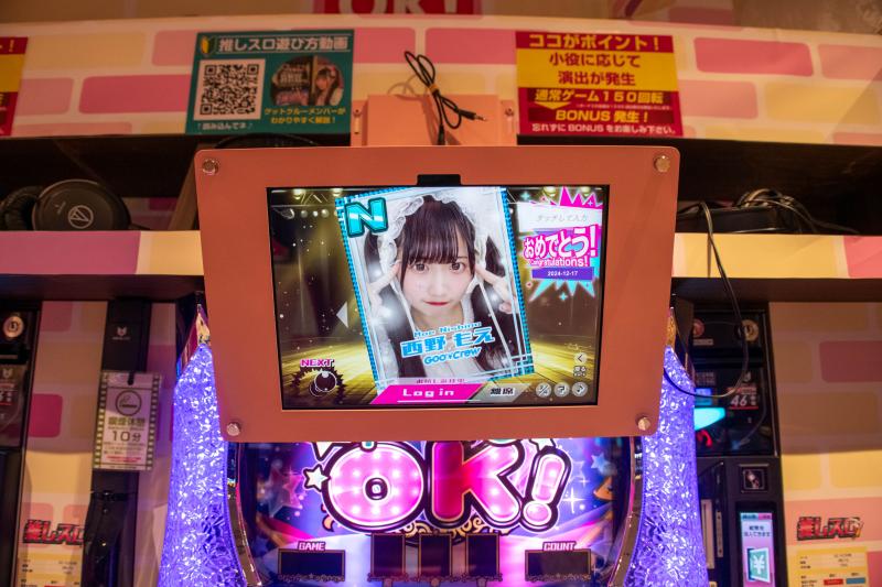 本機に搭載されているのは、グットクルーやSITRA.、meluQ、かがやき from ほくりくアイドル部、すたんぴっ!の現役アイドルグループ5組。『推しスロ』にエントリーしているアイドルの店舗でしか手に入らないトレカやアイドルグッズなどを景品として用意することで、ノンユーザーにパチスロを楽しんで多角的に楽しんでもらう。店内にはカフェスペースがあり、オフ会などのファンイベントを通じて『推しスロ』の魅力を訴求していく予定だ。