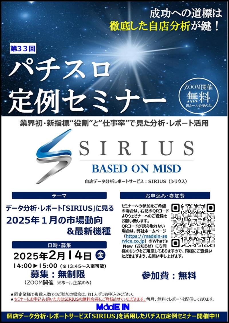 業界初の新指標を用いた自店舗実績データ分析・レポートサービス 「SIRIUS(シリウス)」を提供するメイドインサービス(東京都府中市)は2月14日(金)、第33回パチスロ定例セミナーをオンラインで開催する。