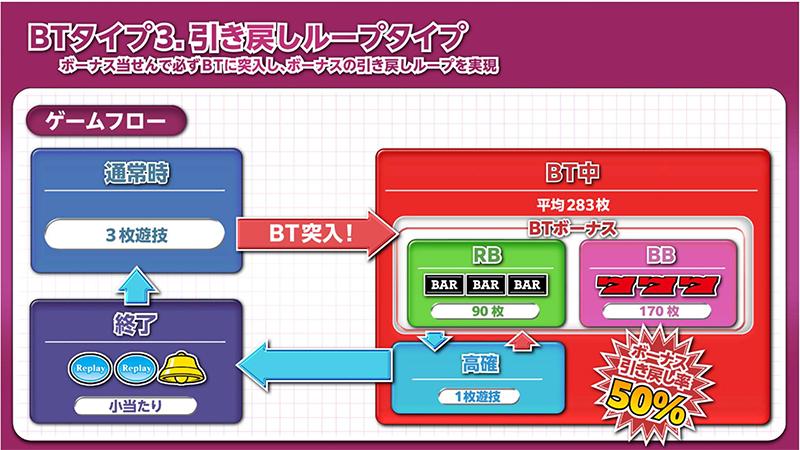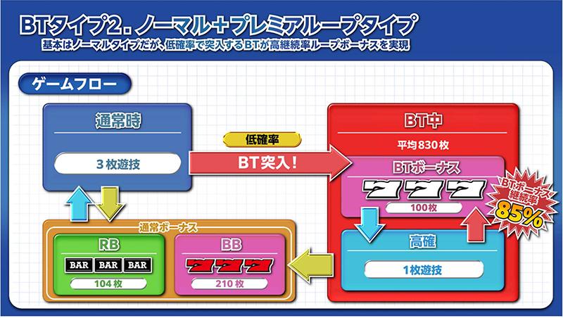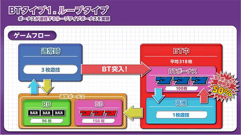 ボーナスが連チャンするループタイプボーナスを実現。3枚遊技を通常状態として、BB(赤7)、RB(バー揃い)当選時はボーナスに応じた払い出しを獲得して通常状態に戻るが、BT(青7)当選時はBT突入となり、高確の1枚遊技に移行。1枚遊技に移行すると、高確率でBB・RB・BTのいずれかに当選する。