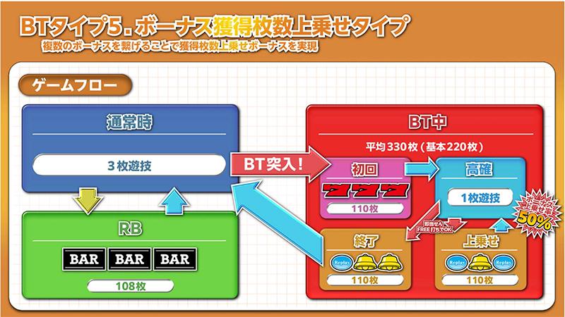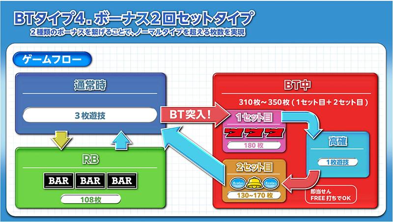 2種類のボーナスをつなげることで、ノーマルタイプを超える獲得枚数を実現。3枚遊技を通常状態として、BB(赤7)に当選するとBTに突入する(RB当選時は通常時に戻る)。