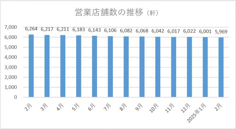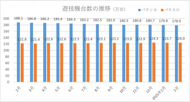 2025年03月19日No.10004788 全日加盟店舗、6000軒を割る 全日本遊技事業協同組合連合会が集計した組合加盟店舗の実態調査によると、2025年2月末時点の営業店舗数は5969軒で、前月より32軒(0.5%)減少した。新規店舗数は0軒、廃業店舗数は29軒、当月中の休業店舗数は8軒。 パチンコ遊技機台数は178万9408台で、同9962台(0.6%)減少した。パチスロ遊技機台数は124万171台で、同2746台(0.2%)増加。遊技機総台数は302万9579台だった。 文=アミューズメントジャパン編集部