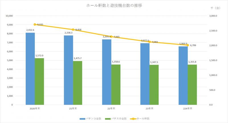 それによると、2024年12月末時点のパチンコホール店舗数は6706軒。前年比で377軒(5.3%)減少した。ぱちんこ遊技機は196万9913台で、同10万7728台(5.2%)の減少。回胴式遊技機は135万5839台で、同8373台(0.6%)増加した。