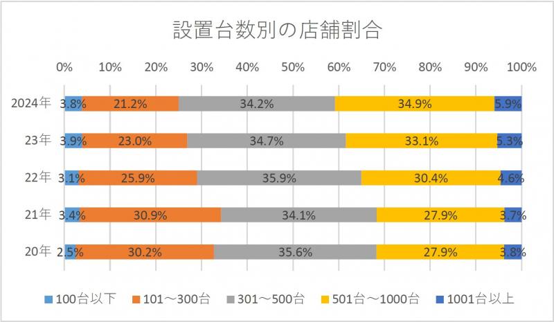 1店舗当たりの備え付け台数は496.0台で、前年比12.4台(2.6%)増加した。台数規模別にみると、100台以下の店舗割合は同0.1ポイント減、101~300台が同1.8ポイント減、301~500台が同0.5ポイント減、501~1000台が同1.8ポイント増、1001台以上が同0.6ポイント増加した。