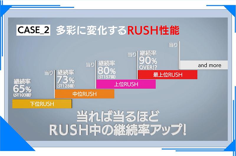 また当たれば当たるほど性能がアップするRUSHも実現可能に。例では、下位RUSH(ST103回、継続率65%)中の大当たりで、中位RUSH(ST128回、継続率73%)にアップ、さらに連チャンすることができれば上位RUSH(ST157回、継続率80%)、最上位RUSH(継続率90%OVER!?)へと性能がアップしていくという。
