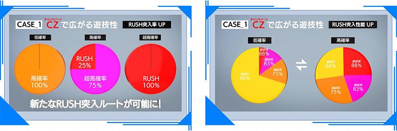 「RUSH突入性能UP」は、CZによって発生する低確率と高確率それぞれの状態で、RUSH突入割合が変化する仕様。また「RUSH突入率UP」と「RUSH突入性能UP」を組み合わせることもできるという。
