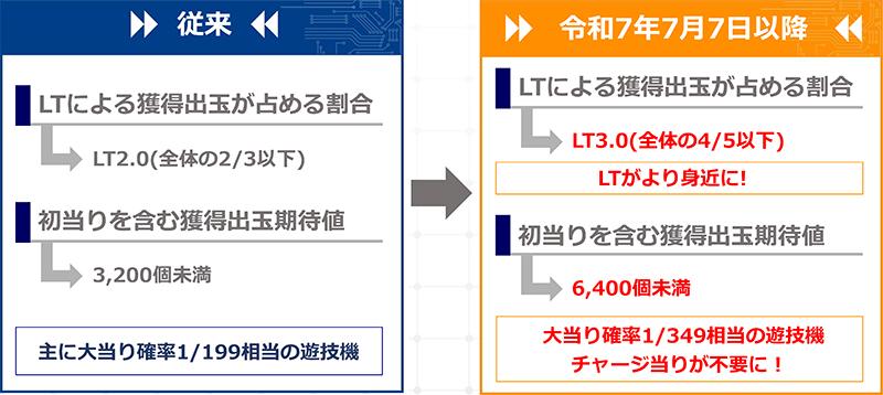 まず「LT機の条件変更」について。これはスマパチ(e機)のみの変更点となる。従来のLTによる獲得出玉が占める割合は、全体の2/3以下とされていたところ、全体の4/5以下になることでLTがより身近になった。さらに初当たりを含む獲得出玉期待値は、3200個未満から6400個未満となり、大当たり確率1/349の遊技機でもチャージ当たりが不要になった。