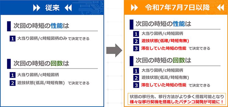 続いて、P機とe機共通の変更点「時短の性能仕様変更」について。従来の次回の時短性能は「大当たり図柄/c時短図柄のみ」で決定できる仕様だったが、それに追加して「遊技状態(低確/時短有無)」、「滞在していた時短の性能」で決定できる仕様に。また次回の時短回数は、「大当たり図柄/c時短図柄」、「遊技状態(低高/時短有無)」で決定できるというものだったが、これに加えて「滞在していた時短の性能」でも決定できることになった。