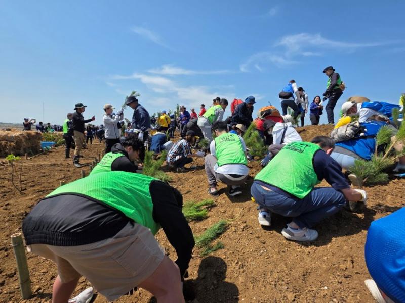 当日は、およそ100メートルの海岸線に造成された丘陵地帯に、500人の参加者が9種類3000本の苗木を植えた。