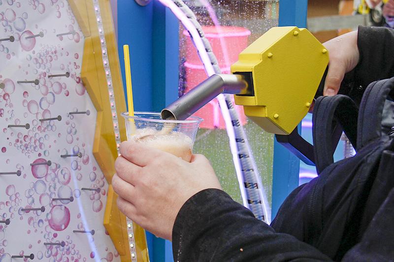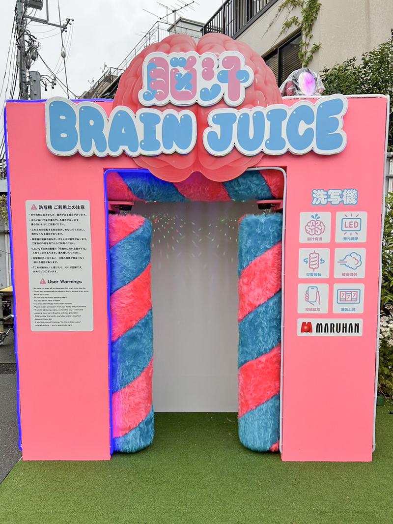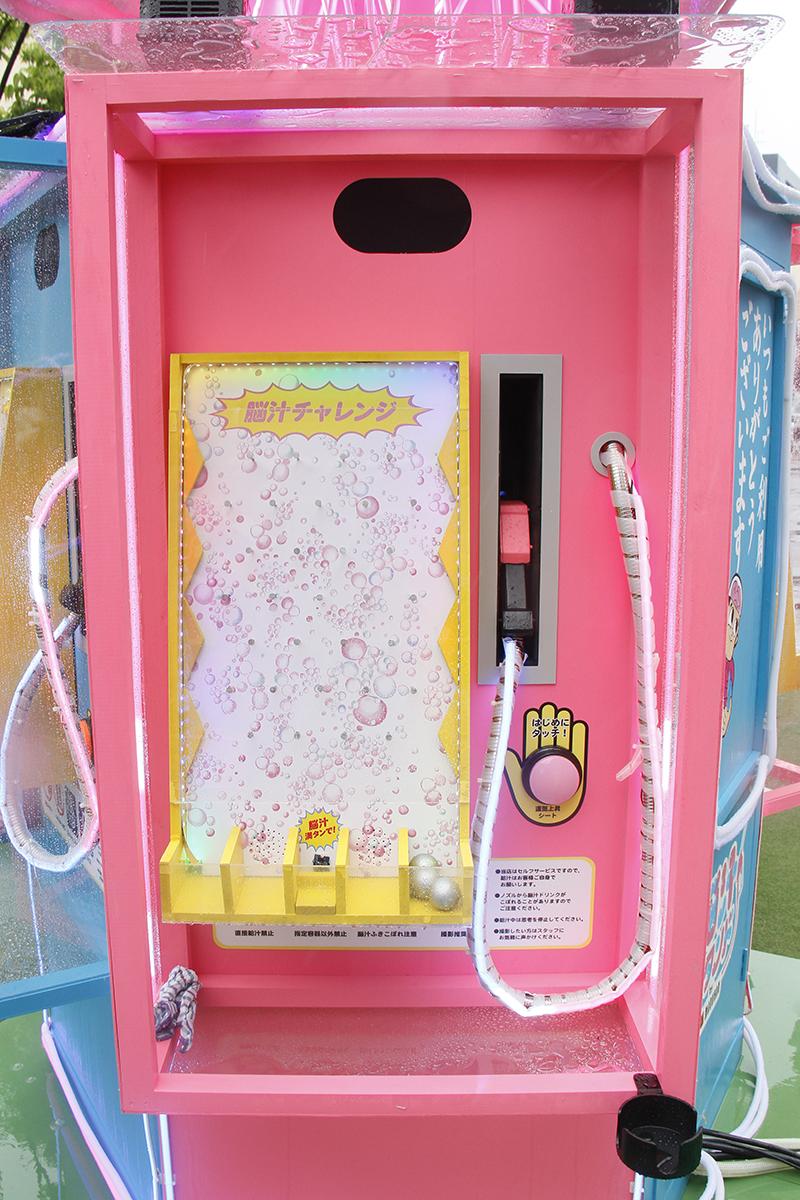 会場の中心に、巨大な脳みそがつながったガソリンスタンドの給油機風のマシーンを設置。このマシーンの給油ノズルから、脳汁をイメージしたスペシャルドリンク「脳汁ドリンク」をコップに注ぐことができる。