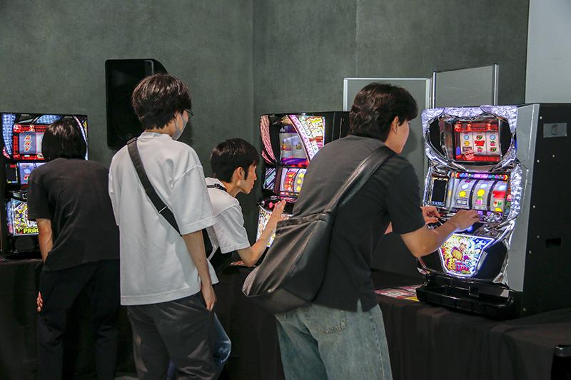 このファン向けイベントでは、超ディスクアップHYPERに代表される特別仕様の目押し機をプレイ可能。ホール導入直前の『e東京リベンジャーズ』(7月7日導入予定)や『スマスロ 東京リベンジャーズ』(9月8日導入予定)の実機展示も行っている。大画面に映し出されるPVも見逃せない。
