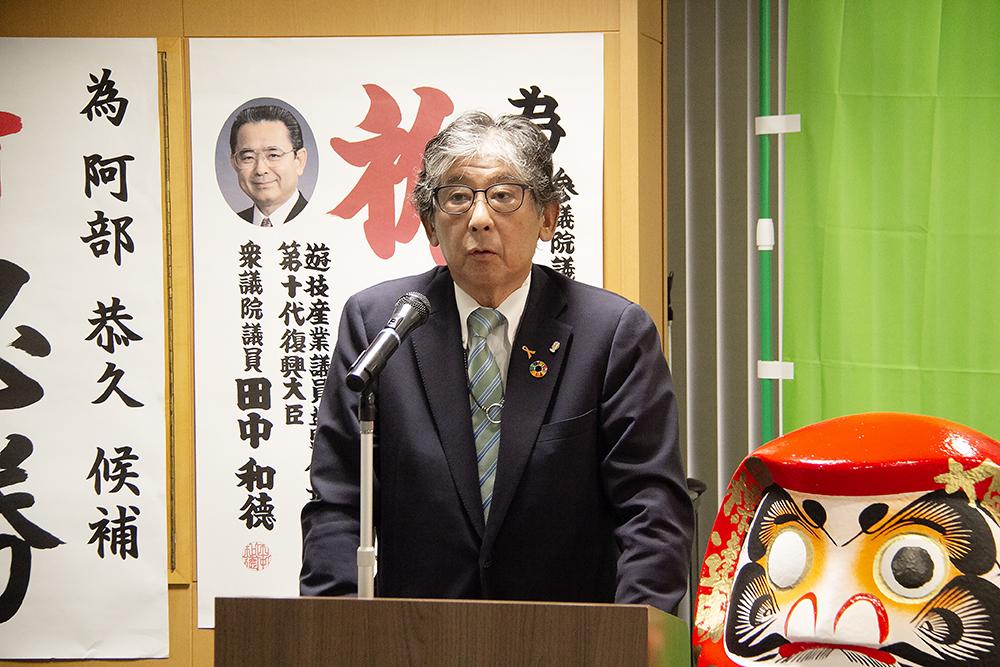来賓として駆け付けた自民党遊技産業議員連盟の田中和徳衆議院議員は「いよいよ戦いの時がやってまいりました。阿部さんをなんとしても国会へ。皆さんの燃える思いが結実する時です。この戦い、なんとしても勝利しなければなりません。遊技産業の命運はこの戦いにあります。私たち議員連盟もできる限りの力を振り絞って戦って参ります。共に頑張りましょう!」と激励の言葉を贈った。
