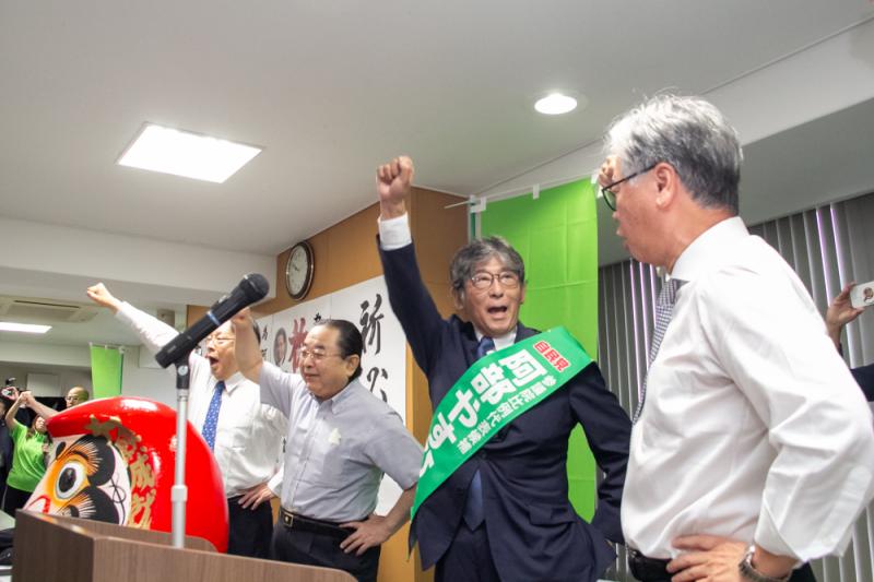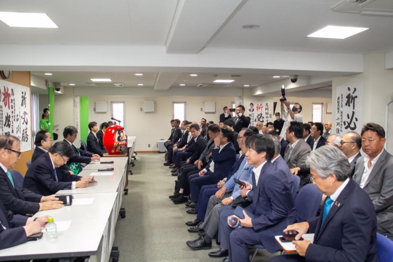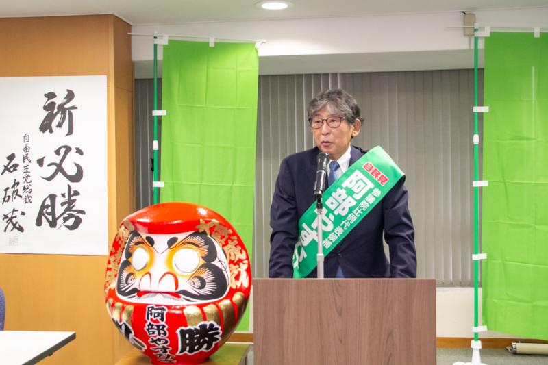 出陣式には業界関係者ら約120人が集まり会場の大会議室に入りきれないほどの人で熱気に包まれた。冒頭に主催者である阿部やすひさ後援会の千原行喜会長があいさつに立ち、「待ちに待った時がきました。我が遊技産業をはじめ、友好団体のみなさんの、それぞれの産業の未来がかかった戦いであります。私たちの手で時代を変えることができるんです。私たち自身の手で勝ち取ろうじゃありませんか」と気勢を上げた。