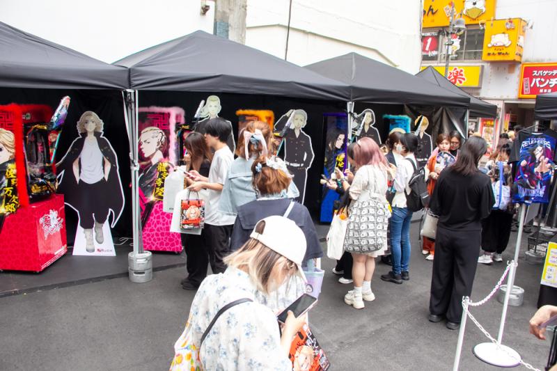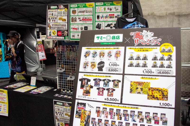 会場内にはリベパチの全国導入を知らせる大型バナーと、東京リベンジャーズに登場するキャラクターの等身大キャラパネルを並べて実機6台を展示。サミー商店のテントではリベパチのオフィシャルグッズなどが販売された。