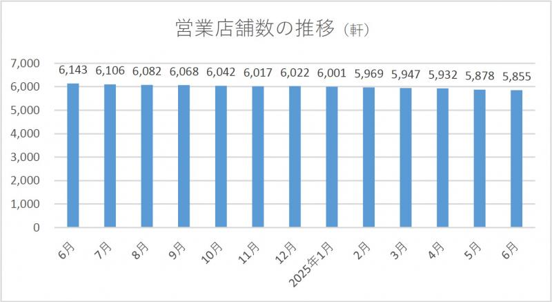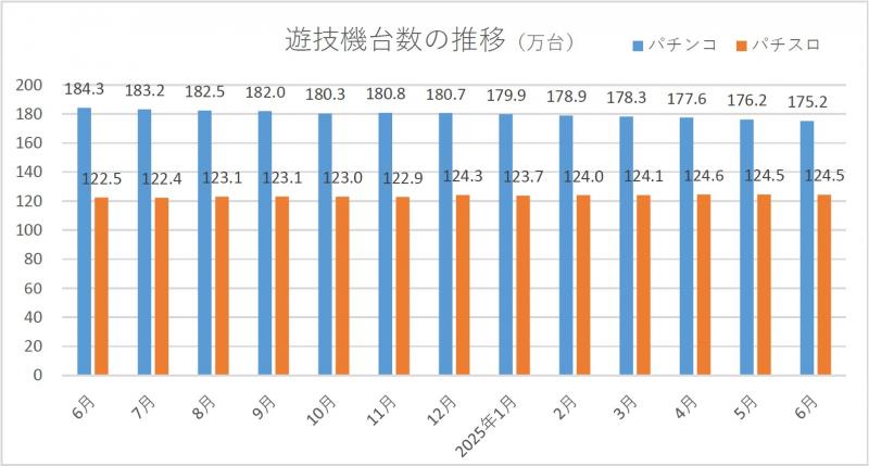 2025年07月23日No.10004935 全日加盟の営業店舗、6月末時点で5855軒 全日本遊技事業協同組合連合会が集計した組合加盟店舗の実態調査によると、2025年6月末時点の営業店舗数は5855軒で、前月より23軒(0.4%)減少した。新規店舗数は0軒、廃業店舗数は20軒、当月中の休業店舗数は11軒。 パチンコ遊技機台数は175万1853台で、同1万521台(0.6%)減少した。パチスロ遊技機台数は124万4885台で、同327台(0.0%)減少。遊技機総台数は299万6738台で、300万台を下回った。 文=アミューズメントジャパン編集部