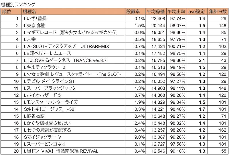 機種別稼働ランキングでは上位機種の多くは上期の新台で構成されました。特に『東京喰種』は稼働・粗利・設定効果でバランスに優れ、総合力の高い機種として評価されています。『マギアレコード』『吉宗』『いざ!番長』も安定した実績を残し、店舗運用において信頼性の高い選択肢となっています。
