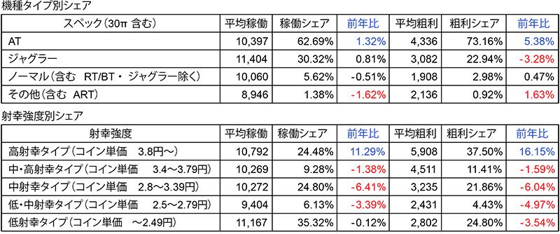 一方、設定1の出玉率上昇により全設置機種での平均出玉率が97%後半に達する現状、等価営業ではALL①でも利率14%前後と粗利確保に苦慮する店舗は多く、大変厳しい状況です。設定の判読性は集客・粗利面に直結するため、機種毎の利率差が設定調整環境に大きく影響を与えています。
