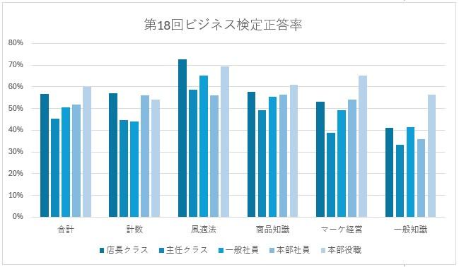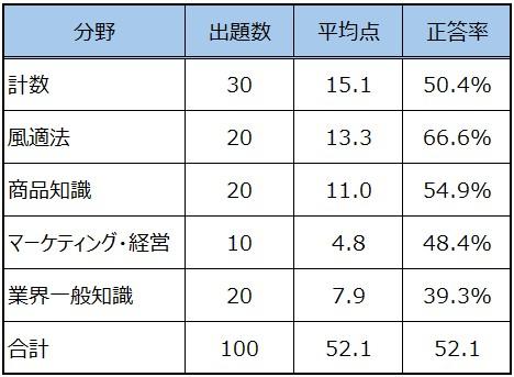 前回の受検者数は、店長クラス321人、主任クラス203人、一般社員159人、本部社員・役職者28人の計711人で、受検企業数は69社。平均得点は52.1点だった。各分野の平均得点や正答率などは以下の図の通り。