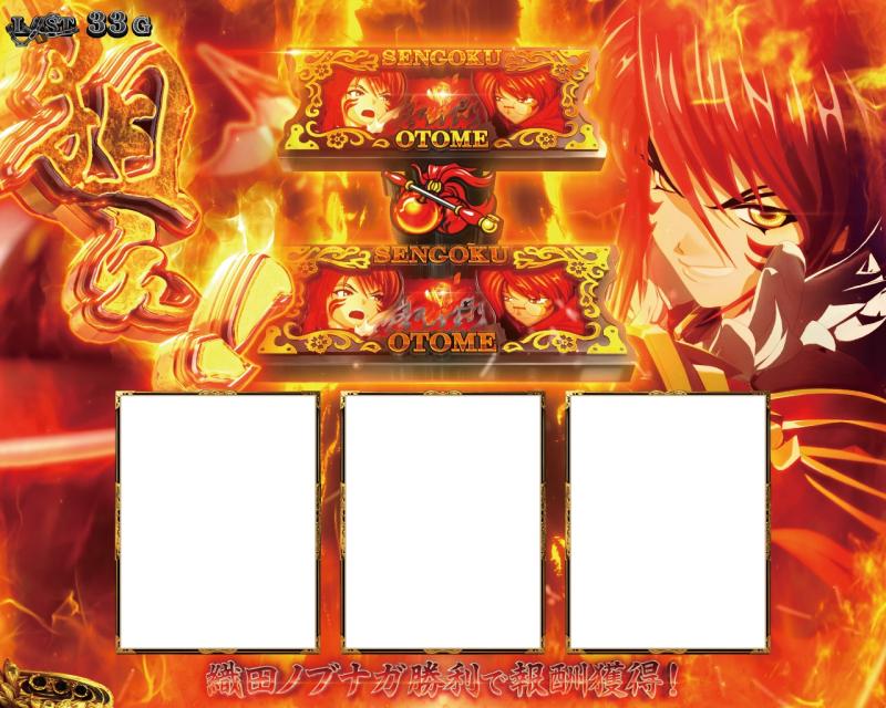 下パネルに描かれた織田ノブナガと明智ミツヒデの激突が示すように、AT中ではCZ「本能寺の変」(4G+α)がその後の行方を大きく左右する。「狙え!」発生時に、「バー・チェリー・バー」を中リールに射止めるとノブナガが勝利。G数上乗せの「出陣BONUS」を獲得する。成功確率は50%(設定1)。