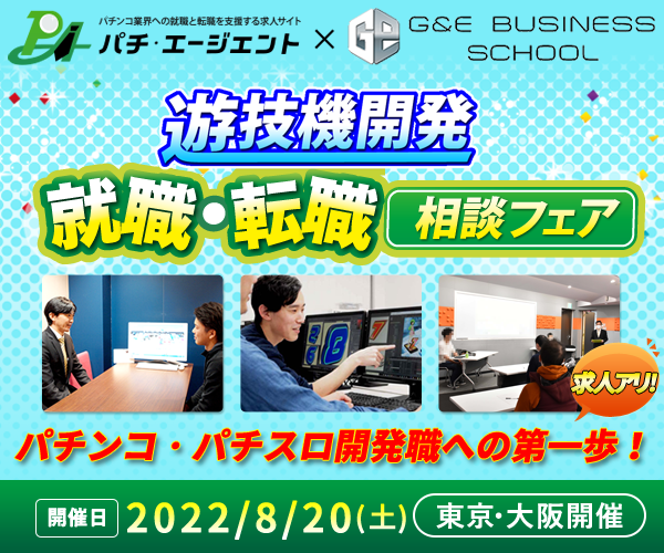 2022年07月19日 ニュース G&Eビジネススクール×パチ・エージェント「遊技機開発 就職・転職相談フェア」を開催 パチンコ業界への就職を目指す専門学校G&Eビジネススクール(渋谷区)と、パチンコ業界への転職支援サービスを行うパチ・エー…