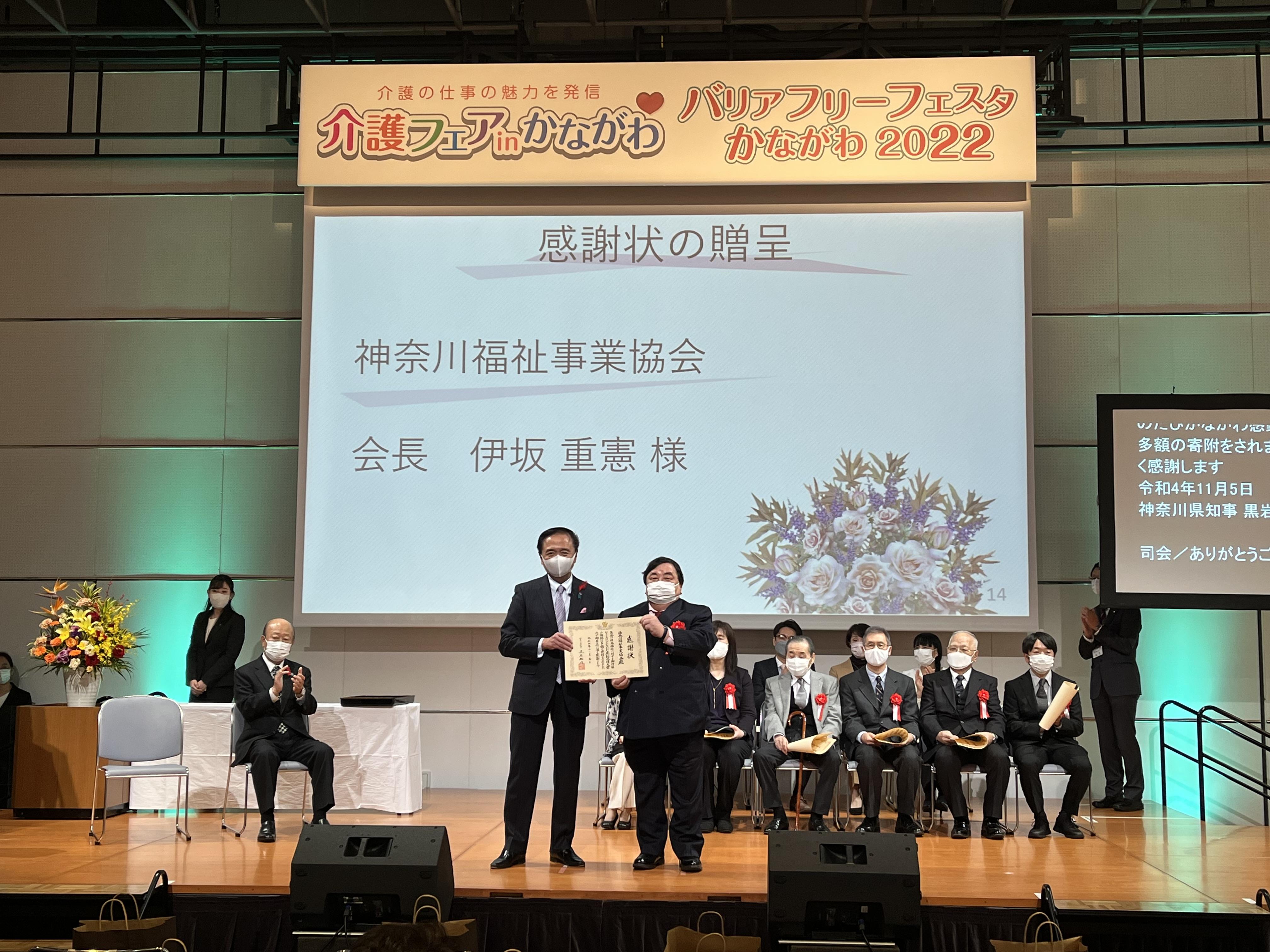 2022年11月17日 ニュース 神奈川福祉事業協会が50万円寄付で知事感謝状 神奈川福祉事業協会は11月5日、黒岩祐治知事から感謝状を贈られた。「第10回かながわ感動介護大賞」に50万円を寄付したた…